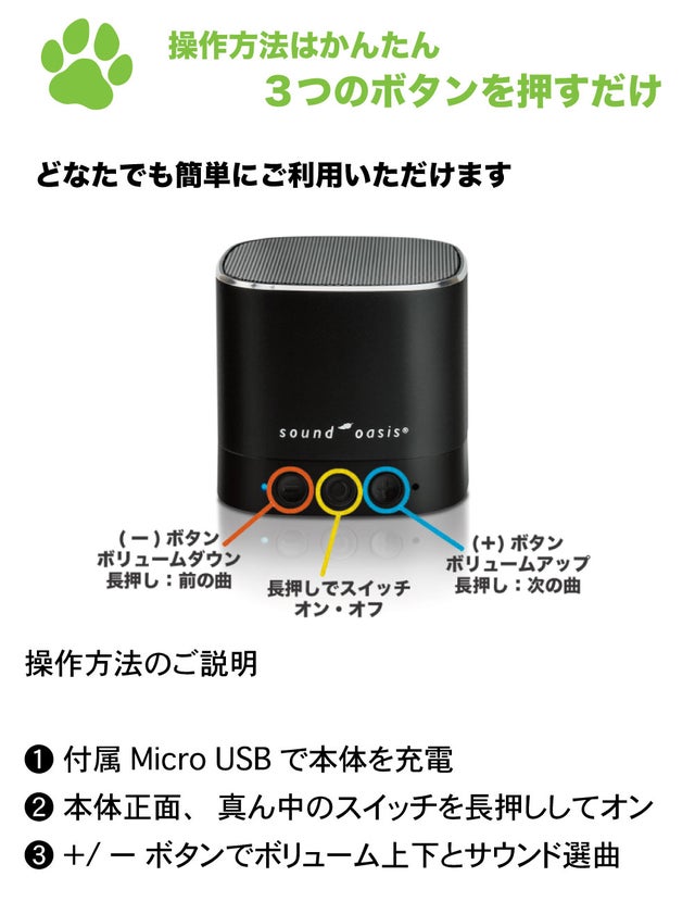※リターン品の配送が完了するまで、ウェザリージャパン株式会社はサウンドオアシス社の日本における独占販売権を有する正規代理店です。詳細に関しては、ページ下部のリスク&チャレンジをご確認ください。 急速に高まるテレワークなどの環境変化によって、飼い主さんの生活スタイルも大きく変化しています。その中で、影響を消すことができない大きな要因が「音」です。 「天候」「サイレン」「チャイム音」などで、一緒に暮らすわんちゃんや猫ちゃんが大きな影響を受けていることがあるかと思います。また、お留守番などで発生する「無音」の状態は、野生動物などが緊張感が高まった夜中などに狩りをする環境と似た状態になり、緊張感が生まれて大きな影響を与えてしまう場合があると言われています。 外出時やお昼寝などの際に、「ただスイッチを入れて音楽を再生するだけ」。1楽曲8時間再生のため、途中で切れてしまう心配がなく無音状態を避けて快適なサウンドを。 自然の中に溢れるサウンドや聴き慣れたサウンドと共にホワイトノイズが空間を包み込みます。 専門家が開発した「ペットのための20曲」を収録。「心音」や「猫ちゃんが喉を鳴らすゴロゴロ音」などにホワイトノイズをMixした「ペットのための快適サウンド」。 サウンドオアシスペットには、自然の音楽を長年監修している専門家のバテール博士が監修した「ペットのリラックスタイム」のために選曲された20曲の楽曲が収録されています。心臓の音を再現した「心音」をはじめ、楽器のリズムや楽器が持つ特徴を活かしたリラックスタイムに最適なサウンドです。 ウェザリー・ジャパン株式会社は、「新しい眠りと健康を世界から」を理念に2005年に設立。その後、数多くの革新的な眠りと健康をサポートする製品、及び新しいライフスタイルをサポートする製品を世界中から発掘、日本国内にて正規販売代理店として発売しております。 製造メーカーは カナダ サウンドオアシス社、生産国は中国となります。ウェザリー・ジャパン株式会社はサウンドオアシス社製品の日本正規代理店となります。 サウンドオアシス社はこれまで多くのサウンドに関する製品を発表しておりました。今回、ご支援者、お客様からの多くのご意見を今回発売いたします最新モデル、サウンドオアシスペットに取り入れ、新しいサウンドケアをお届け出来ることなりました。 弊社が長年に渡りサウンドオアシス社の製品を取り扱ってきた大きな理由は、「音」の世界にこだわりぬいてきている実績です。「音」は、エンターテイメント、環境、など生活にかかせないものだと思っています。そして、その「音」にこだわり抜いてきたメーカーだからこそ開発できる製品が今回「ペット専用」のものとして発表できることになりました。 製品の保証は1年間の製品保証ならびに皆様からのお問い合わせなどは、ウェザリージャパンがしっかりと国内対応(日本語対応にて)を行わせていただきます。 「大切な家族」と共に過ごす快適なツールとしてご利用いただけたら幸いです。 (リターン品の配送が完了するまで、ウェザリー・ジャパン株式会社はサウンドオアシス社の日本における独占販売権を有する正規代理店です。詳細に関しては、ページ下部のリスク&チャレンジをご確認ください。)