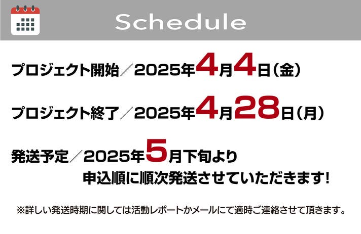 プロジェクト終了後お申し込み順に、順次に発送させていただきます。