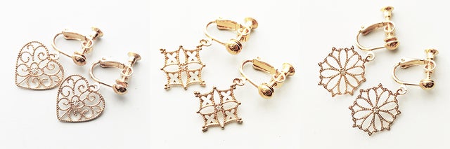 イヤリングとピアスをご用意しています。イヤリングはねじばね式金具ですので簡単に装着出来ます。