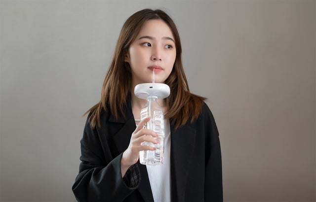 ペットボトルなど身の周りにある容器をタンクとして利用する驚きの発想、さらにノズル部分を折りたたみ可能とする設計により、【FLOSMOREウォーターフロスキューブ】が誕生しました。