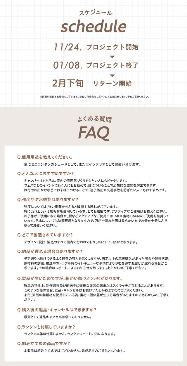 ※ 本文中に記載させていただいたスケジュールは、あくまでプロジェクト公開時点の予定です。 ※ 応援購入の性質上、配送遅延の恐れがございます。 ※ 原則として、配送遅延に伴う応援購入のキャンセルはできません。 リターン配送予定月から6か月を超えた場合には、希望者に限りキャンセルにて対応させていただきます。