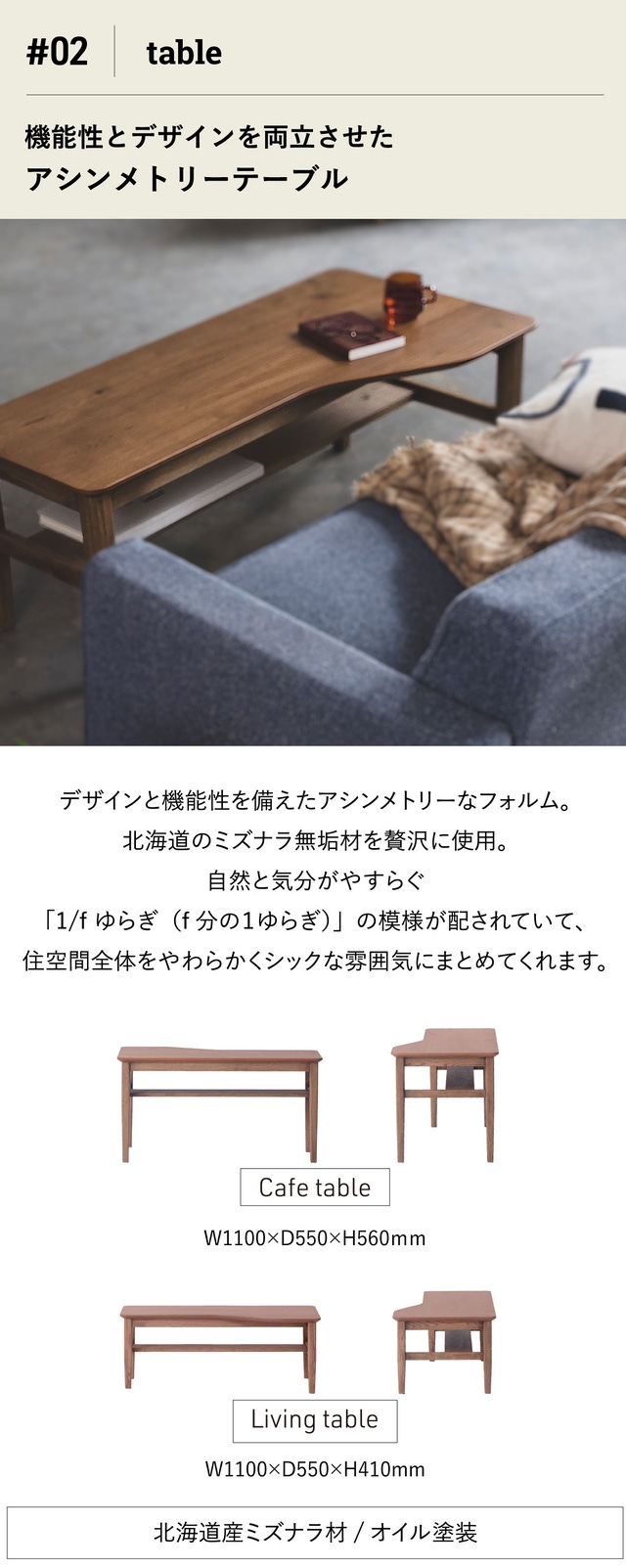 テーブルやスツール、ソファの脚部分など「time」で使用される木材は全て北海道の天然ミズナラ材を使用しています。