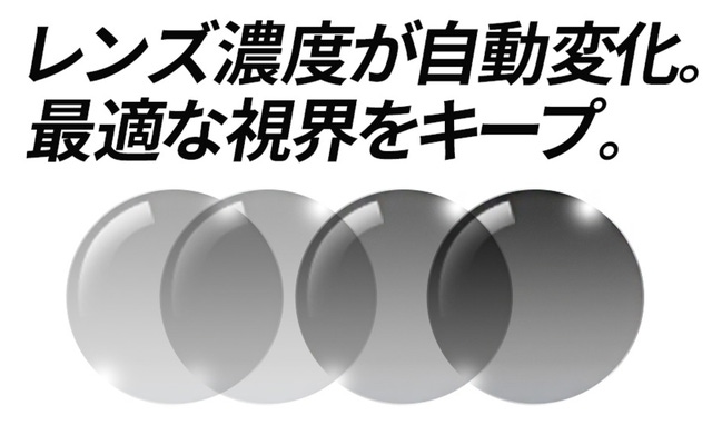 本商品のレンズには、偏光機能に加え、紫外線の強さに応じてレンズ濃度が変化する、調光機能が搭載されています。レンズが自動で視界の明るさを調節し、常に快適な視界を確保します。(※調光レンズの温度変化は気温に影響されます。気温が低い時はより濃く変化し、気温が高い時は温度変化は少なくなります。また紫外線カットガラスに覆われた車内などでは、レンズの濃度変化は少なくなります)