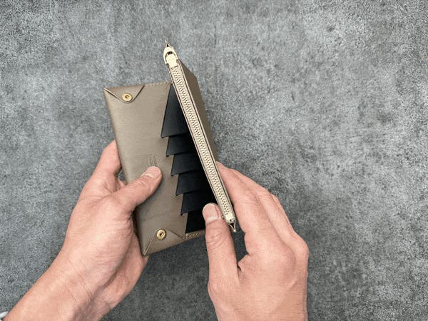 次に、カードを区別する仕切りですが、本プロダクトにはなんと仕切りそのものが存在しません。斜めの切り込みにカードを差し込むことで、カードを独立して収納することができます。よくあるお財布は、カードとカードの間に仕切りが存在しますが、それが財布を厚くしています。