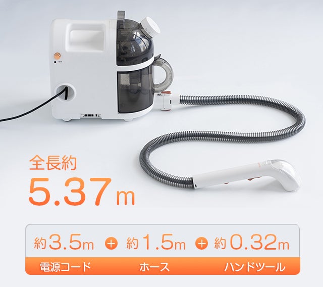 電源コード、ホース、ハンドルまでの全長が約5.37mで、お部屋中のどこでも使えます。