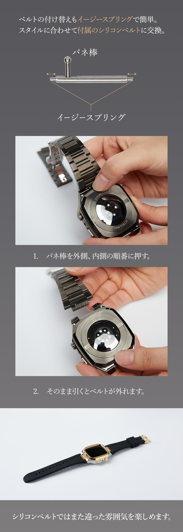 - プッシュボタン式バタフライバックルで着脱簡単。付属のシリコンベルトへの付け替えもワンタッチ。