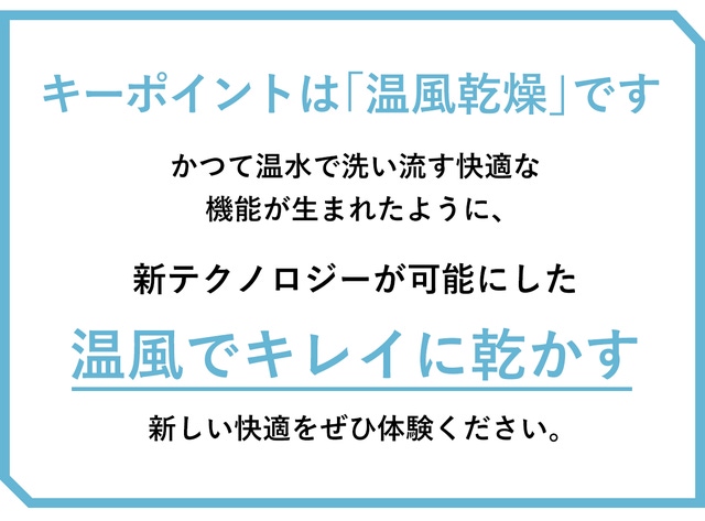 - 温水洗浄と温風乾燥で”触れずに”お尻をキレイにし、世界から「お尻を拭くのがツラい」を無くす