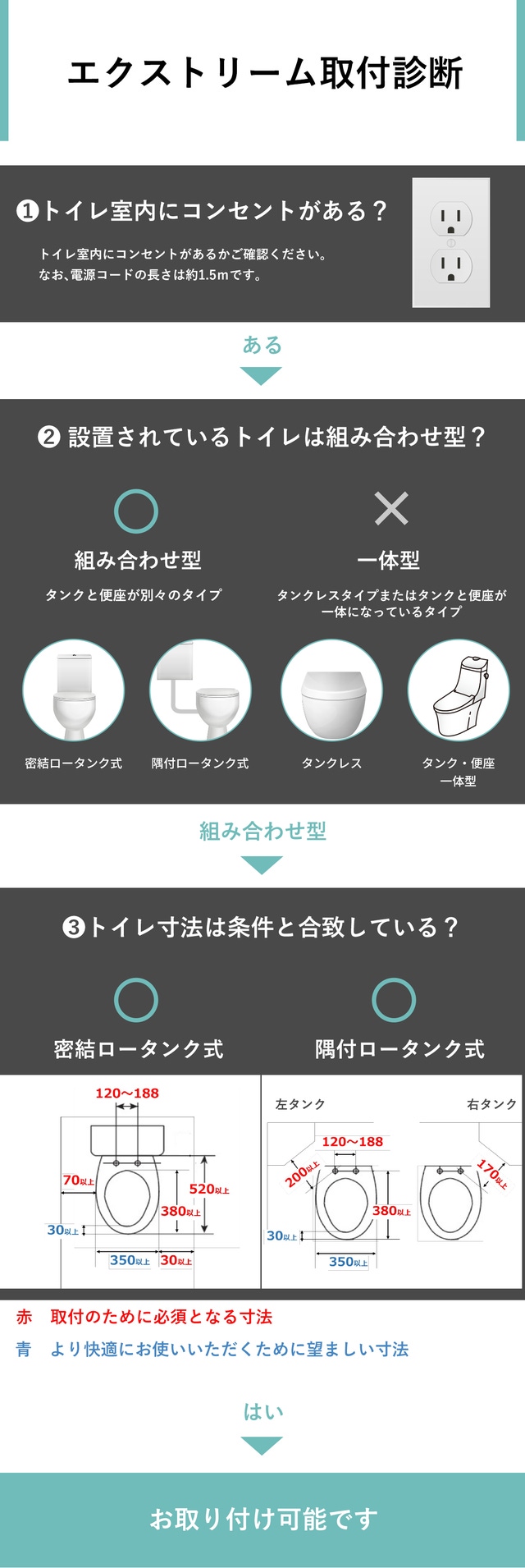 A. 後付タイプの温水洗浄便座が設置されているトイレであれば、ほとんどの場合取付可能です。便器一体型温水洗浄便座への後付はできません。詳しくはフローチャートをご確認ください。