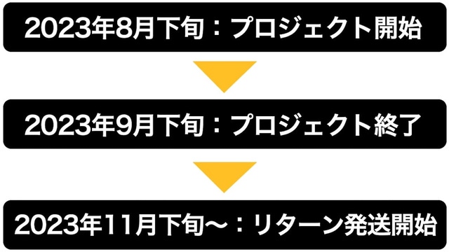 A :リターン内容によって異なり、『スタート割』『超超早割』『超早割』『2脚セット早割』については2023年11月下旬を予定しており、それ以外のリターンについては12月中旬頃の発送を予定しています。