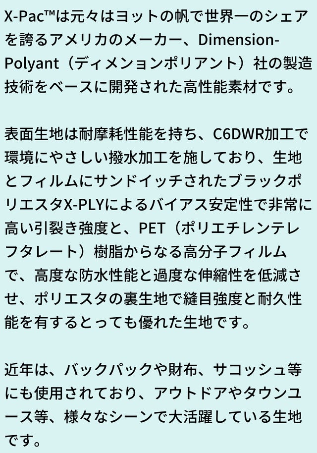※ 本製品での防水試験は行っておらず、X-Pac™素材の特徴となります。