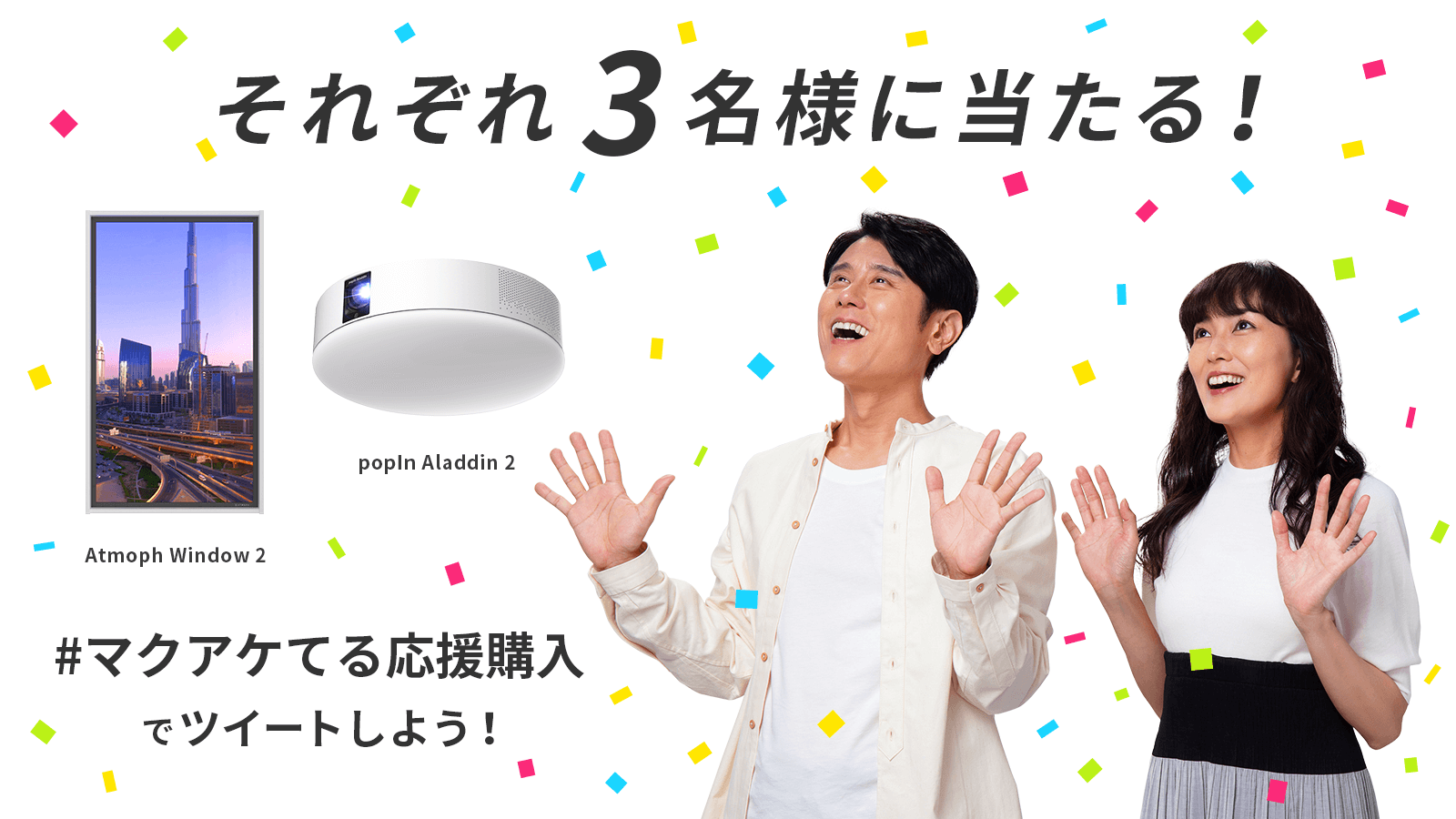 ※プレゼントはCM放送中に実施頂いているプロジェクトの一つ前のモデル(Atmoph Window2、popIin Aladdin2)となります。