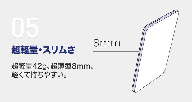 超軽量42g、超薄型8mmで軽くて持ちやすいのが特徴です。
