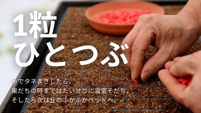 ていねいに。ていねいに。ひとさじ農場は、とにかく手作業が多いです。一粒ひとつぶ手でタネまきしたら。巣だちの時まではたいせつに温室そだち。