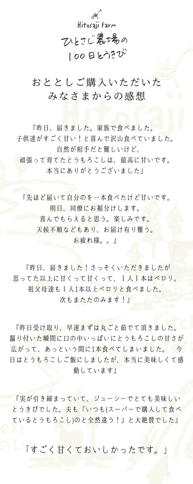 一昨年は未曽有の大干ばつのなか、根気強く100日とうきびを待っていただき本当にありがとうございました。また、昨年の「陽の畑」の100日とうきびはいかがでしたでしょうか。とっておきの畑です。ご満足いただけていれば嬉しいです。