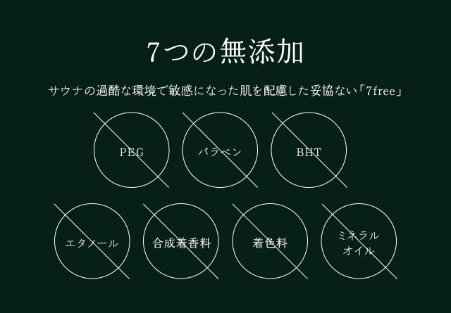 サウナの熱による刺激で肌や髪の毛、頭皮へのダメージをケア・予防するために。そして肌と髪の毛、頭皮のダメージを意識して、より純粋にサウナだけを楽しんでいただきたい気持ちをこめて開発した、サウナ専用スキンケア&ヘアケア製品です。
