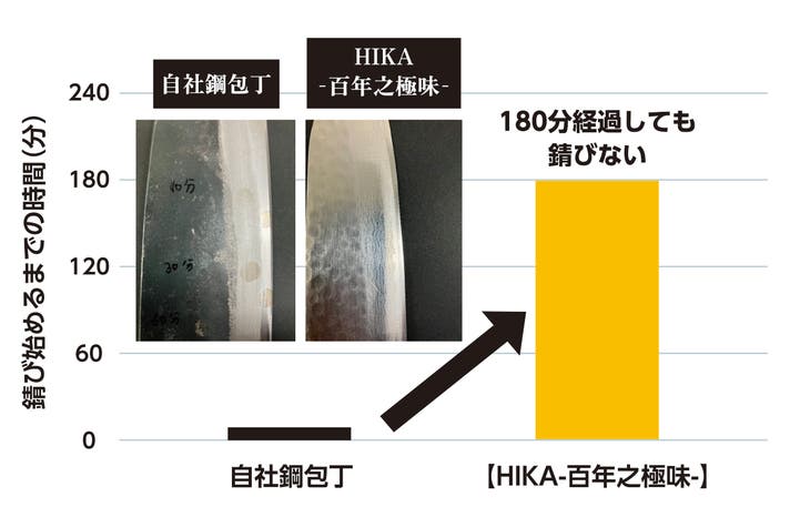 錆びを起こしやすい酢に3時間つけた試験でも錆びの発生はありませんでした。