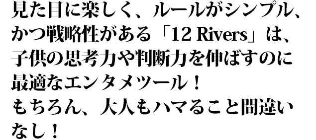 プレイ方法はとてもシンプルですが深い戦略性があります。ボードゲームの上級者も初心者も、誰もが12 Riversに興奮するでしょう。