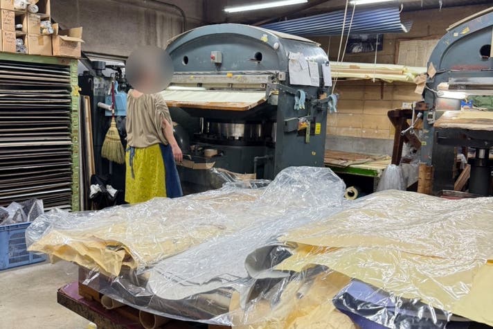西陣織の帯地仕立てに加え、本革胴体・細ベルトの縫製工程を担当。