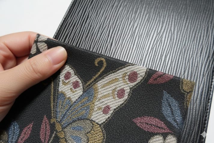 西陣織は切り取る位置によって表情が変わり、本革も裁断位置によって模様が異なります。