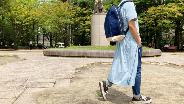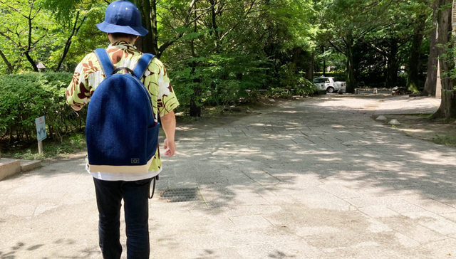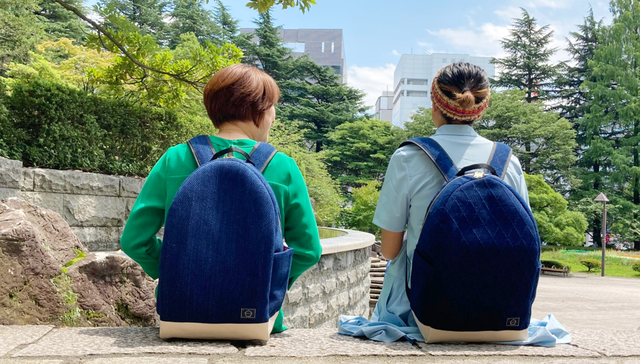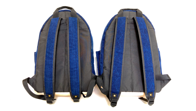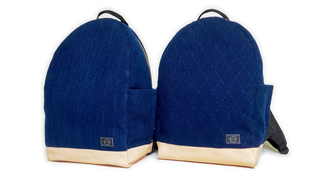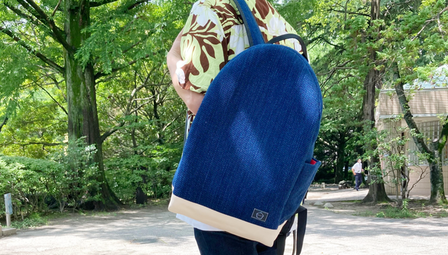 バックパックの表面に使用する武州正藍染は、藍の葉からとった染料を発酵建てで発酵させて染めるのが特徴で、染の手法は糸の段階で染める糸染めと、布にしてから染める型染の二方法があり、バックパックの生地は糸染の生地を使用します。