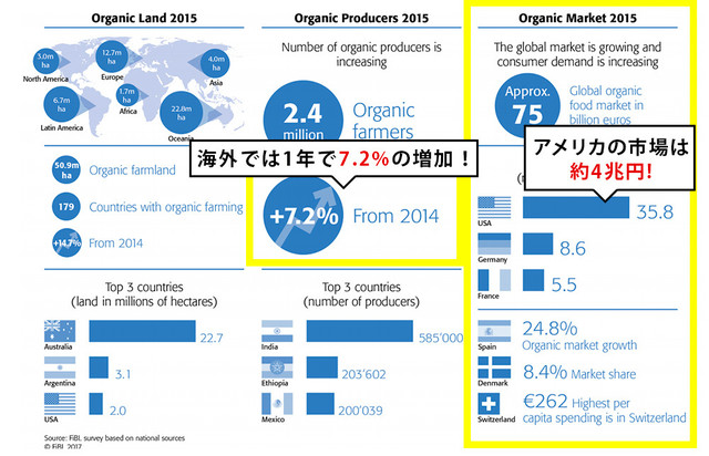 IFORMというオーガニック機関レポートによると、2014年から2015年にかけての有機農家の割合は全世界で平均7.2%も増加しています。
