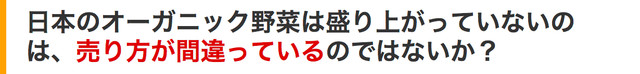 オーガニック野菜の付加価値3大要素は「味覚面」「健康(安心・安全)面」「環境・社会面」だと考えますが、