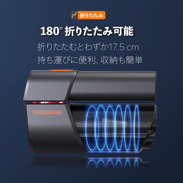 180°折りたたみ式、コンパクトサイズで持ち運びが簡単。本体約600gの軽量タイプです。狭い車内をスムーズに掃除でき、片手でも操作しやすいです。