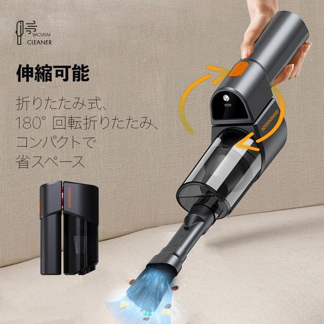 コンパクトなサイズ、180°折り畳み可能なミニ掃除機はコンパクトで軽量なため、持ち運びが簡単です。これにより、家のあらゆる場所や車内など、狭いスペースでも効果的に掃除できます。