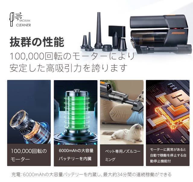 - 6000mAh大容量バッテリー、最大約34分間の連続稼働!スピード清掃、効率大幅にアップ!