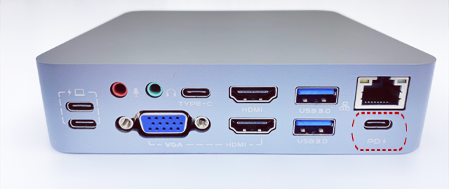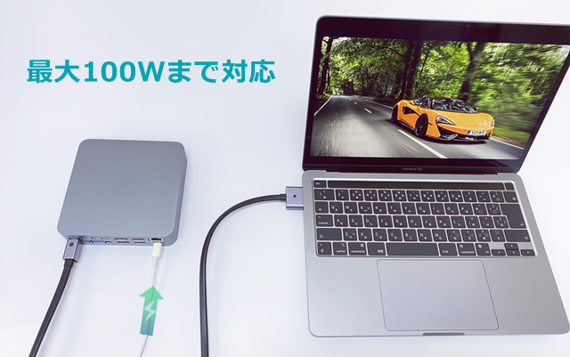 PD対応で、100WまでのUSB PD対応機器の充電が可能です。パソコン付属の純正ACアダプタ(USB PD対応)を接続すれば、パソコンを充電しながら周辺機器を使用できます。