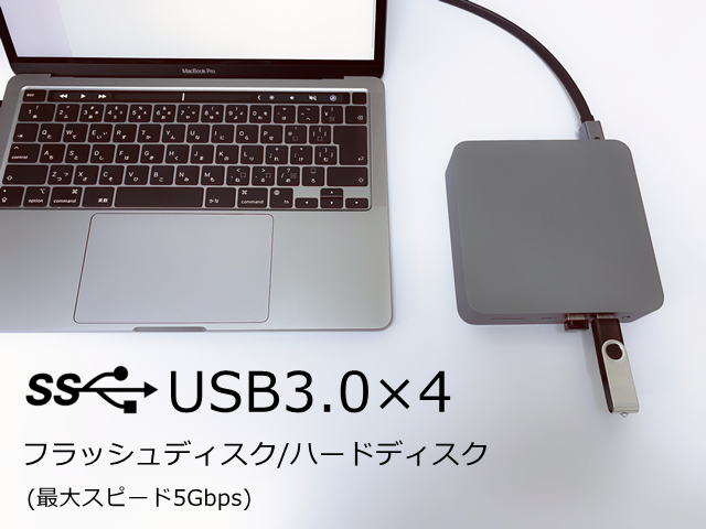 超高速のUSB3.0ハブを4つ搭載。すばやくバックアップやデータコピーが可能です。マウスやキーボード、プリンターなどの接続に便利です。USB 3.0ポートは最大5Gbpsのデータ転送速度を提供します、HD動画も数秒で転送です。