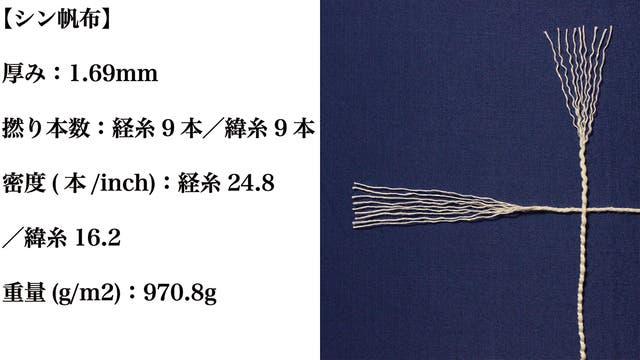 それに対してシン帆布は、10番単糸を縦横ともに9本撚り合わせた糸で織られており、その極太の糸がシン帆布の独自性を支えています。