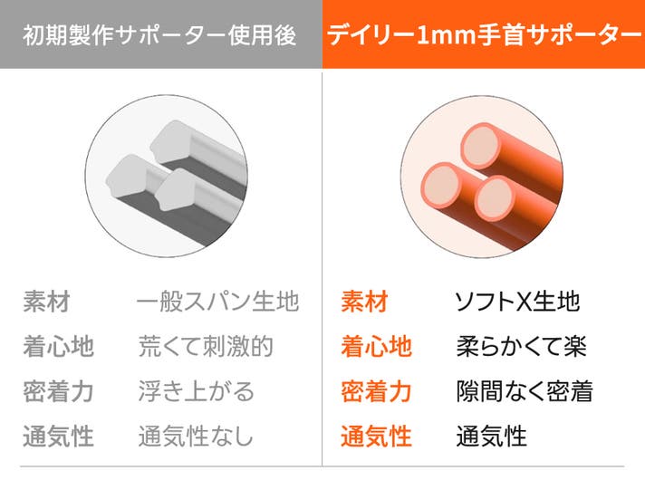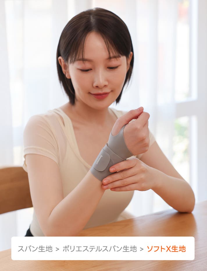 デイリー1mmの手首サポーターは、最適な混用率を組み合わせたソフトX生地を使用し、一般素材とは異なる柔らかな着心地を感じることができます。
