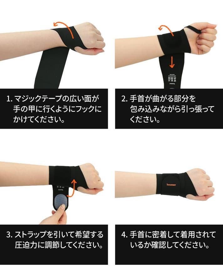 着用位置: サポーターの位置、正確に合わせてください。 手首サポーターを適当に着用すると、期待した効果が見えにくいです。