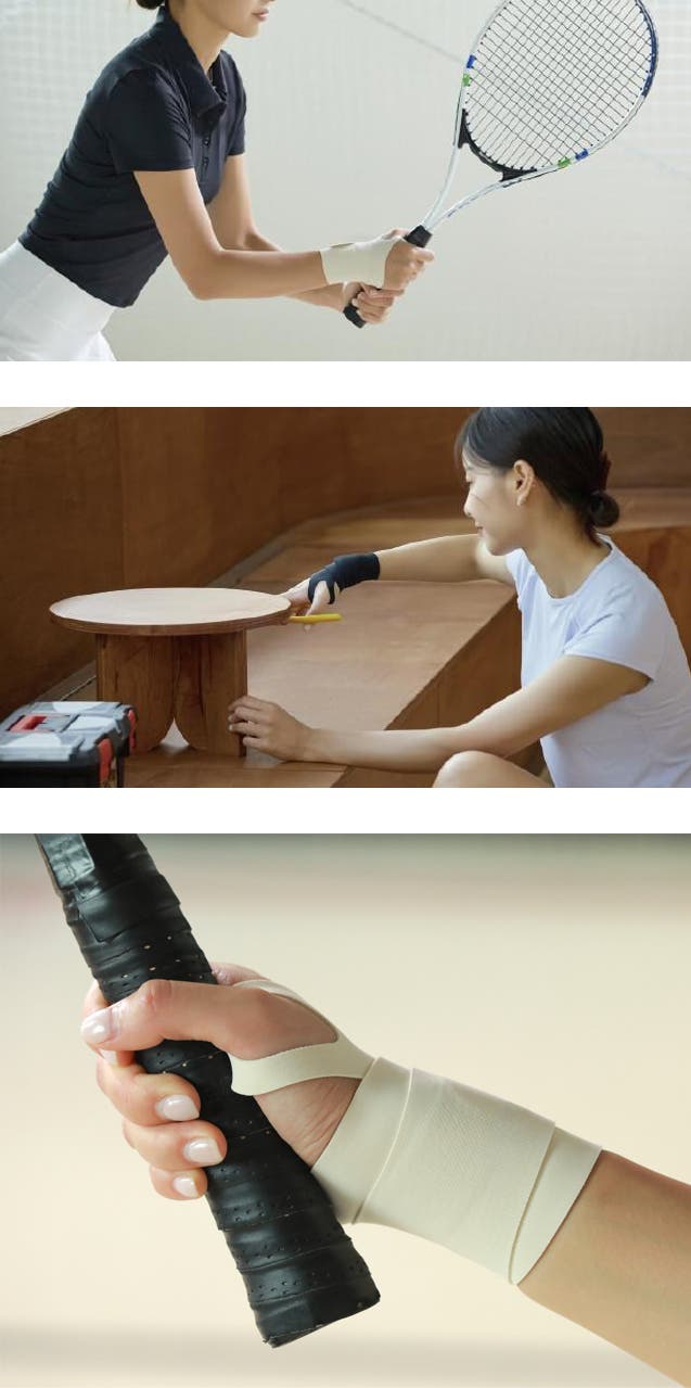様々な悩みと迷いの原因を調べて生地を新しく織り、誰でも悩みなく柔らかく弾力性のある着用ができる手首サポーターを製作しました。