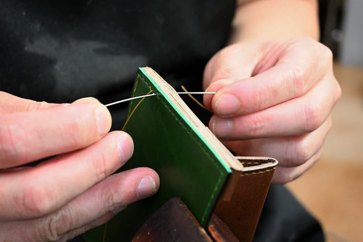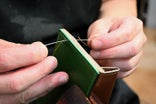 革の厚みに合わせてロウ引き糸を使い、ひと針ずつ手で縫い上げる縫製。