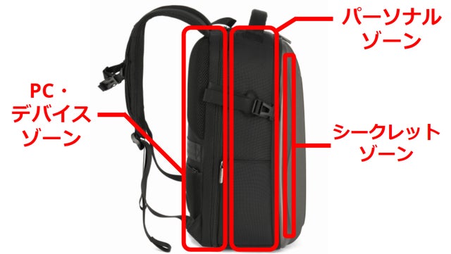 当バックパックは、大きくPC・デバイスゾーン、パーソナルゾーン、シークレットゾーンの3つのスーペスに分けて荷物を収納できます。