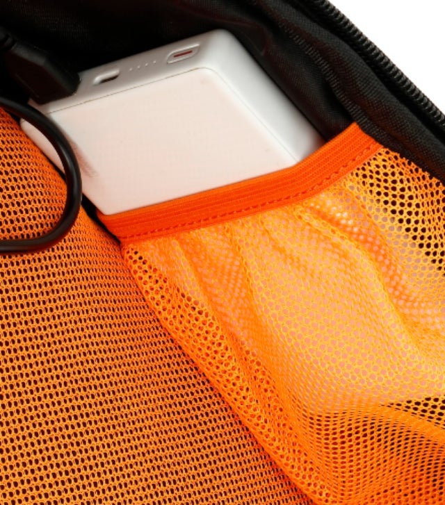 モバイルバッテリーを収納できるポケットで、USBケーブルでスマートフォンを充電することができます。