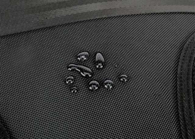 A.当商品はポリエステル生地を使用しており、フロント面は一体成型となっているため、水を通しにくい素材です。他の部分も同じく水を通しにくい素材ですので、瞬間的にかかった水分を通すことはありませんが、水を当て続けると薄い部分から、内部に浸透します。予めご了承くださいませ。