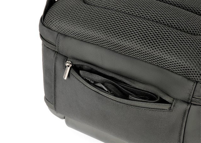 この収納スペースは、バックのフロントカバー部分に守られており、カバーのクッション性と形状維持性により、型崩れせず、衝撃からも大事な荷物を守ります。