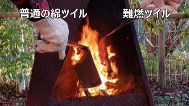 ● 難燃ツイルと普通の綿ツイルを火の中に入れてみました。