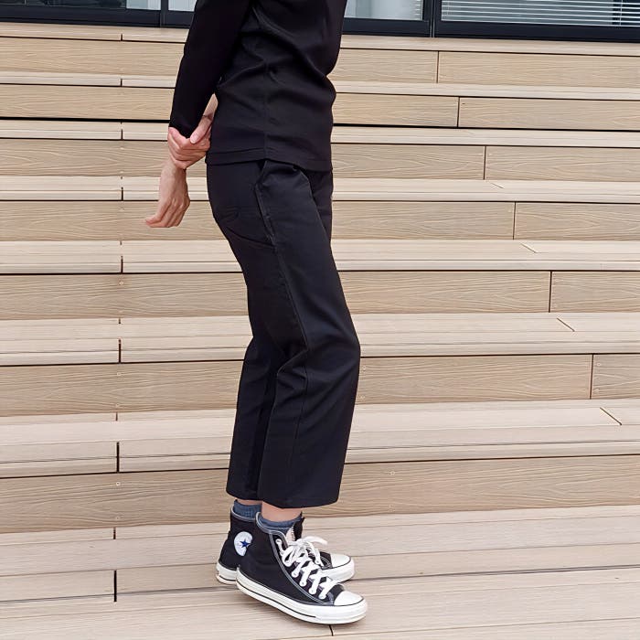丈は足元スッキリお洒落感のある9分丈のアンクルパンツで、通年使える丈感となっています。