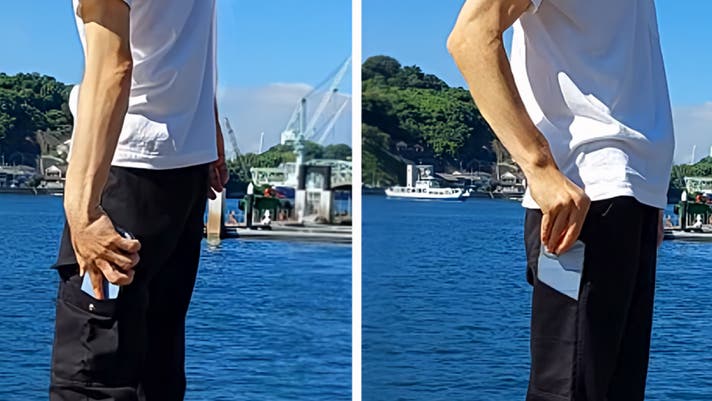 前2個、後2個、脚部2個の合計6個のポケットを装備しており、スマホから財布や鍵など、いろいろなものを入れて持ち運ぶ事ができる、とても便利な仕様となっています。