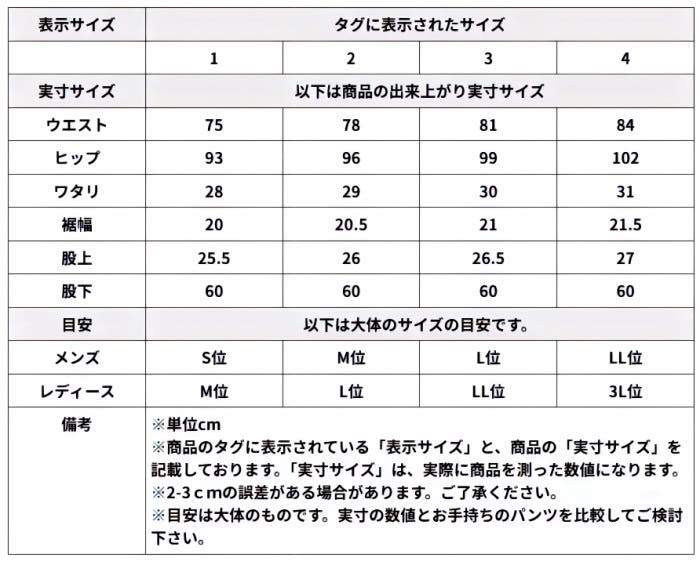 4:ウエスト84、ヒップ102、ワタリ31、裾幅21.5、股下60、股上27