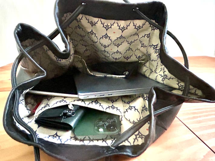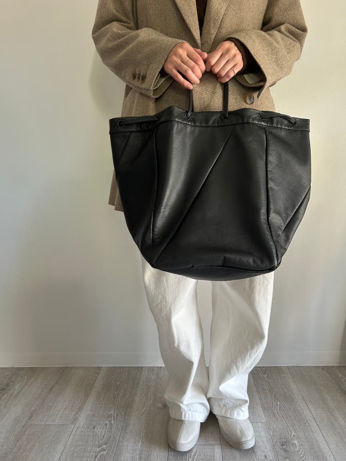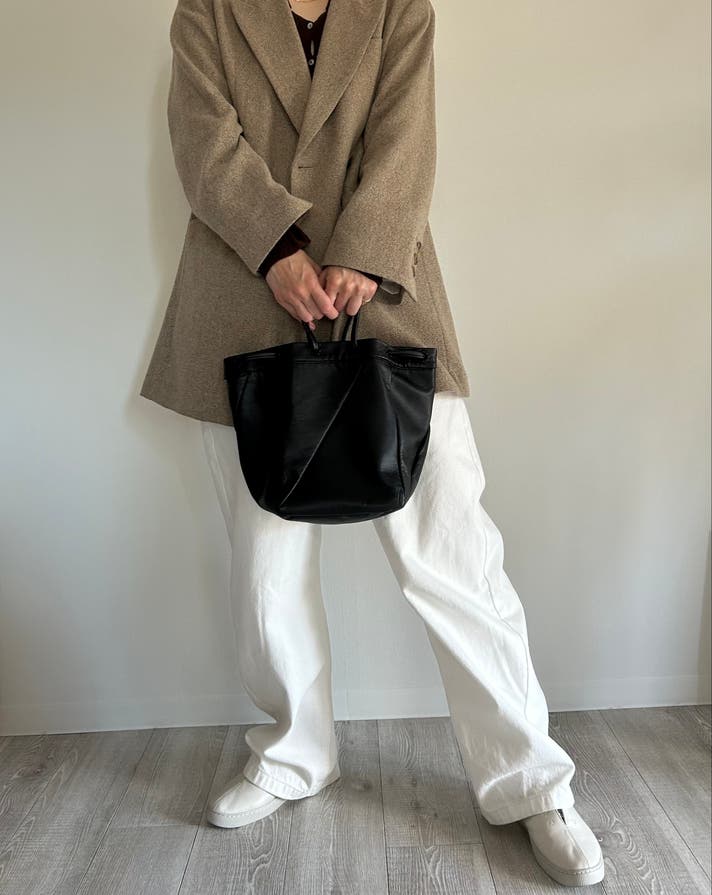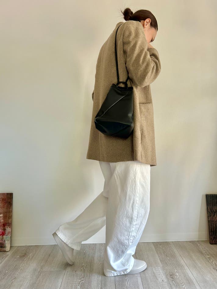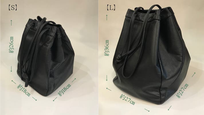 これまでは植物タンニン鞣しの革を使用したシリーズでしたが、北国では雪が降り積もることや、鞄の中にも雨や雪が入らないように巾着型にデザインしました。
