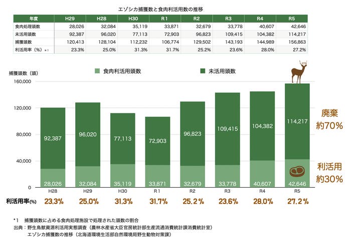 現在は駆除されたエゾシカの約3割が食肉となり、そのほとんどの皮は廃棄されているのが実態です。