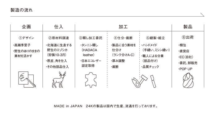 24Kでは、製品作りの原材料となるエゾシカ革の企画、仕入れ、鞣し加工委託、製造まで一貫して行っています。ハンターにはじまり、一つの製品が出来上がるまでには多くの人達が関わっています。