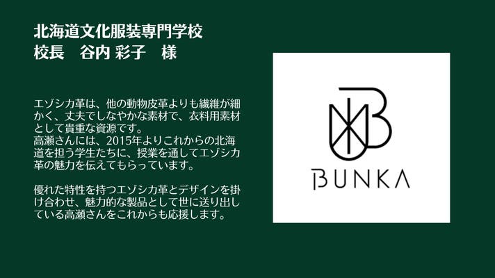 これからのものづくり産業を担っていく学生たちにも、エゾシカ革をはじめとする北海道ならではの素材の魅力をもっと知ってもらい、製品作りに取り入れて欲しい!そんな想いから北海道文化服装専門学校での特別講義や、高校生や大学生からの取材を受けるなど、北海道のものづくり産業の活性化にも積極的に取り組んでいます。