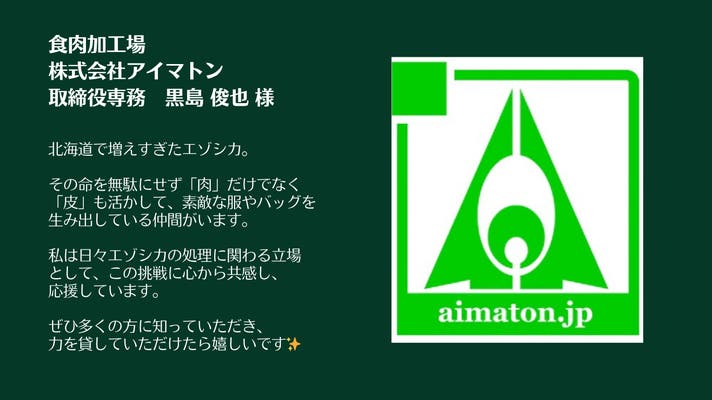 今回Makuakeに挑戦したのは、弊社のことをもっと知っていただきたく、たくさんの人に美しいエゾシカ革製品を使っていただきたい思いと、少しずつでも社会課題の解決につながる行動ができたらと思っております。是非応援よろしくお願いします。