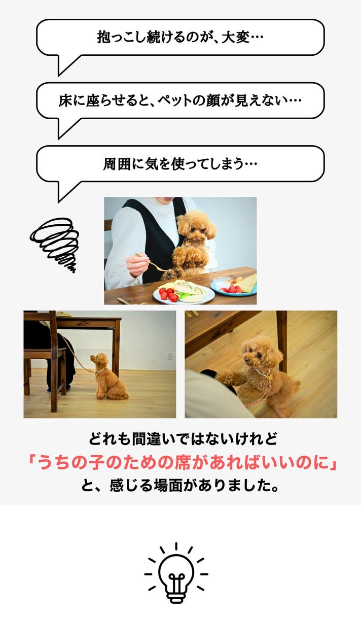 ペットの指定席があれば安心。食事の時間が、もっと穏やかになります。